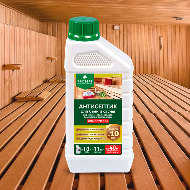 PROSEPT SAUNA - антисептик на водной основе для бань и саун. Предназначен для защиты древесины от действия дереворазрушающих и деревоокрашивающих плесневых грибов в саунах, парных, моечных и прилегающих к ним помещениях. Предотвращает развитие болезнетворных микробов, спор грибков. Обеспечивает надежную защиту при циклическом увлажнении, конденсационном увлажнении и высоких перепадах температур.